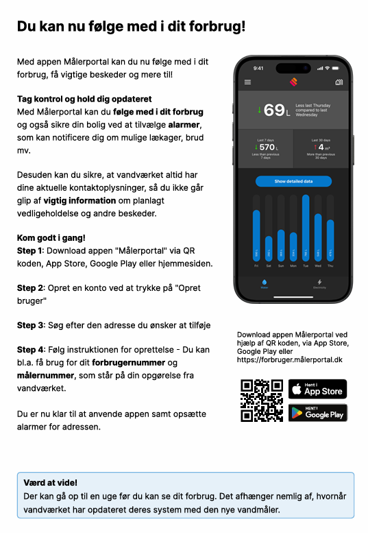 Du har mulighed for at overvåge dit vandforbrug og få beskeder fra din vandmåler, hvis der er urwegelmæssigheder i ejendommens forbrug, heriblandt om læk og brud på vadnledning. Nedefor kan du se hvordan du kan oprette din måler i appen.